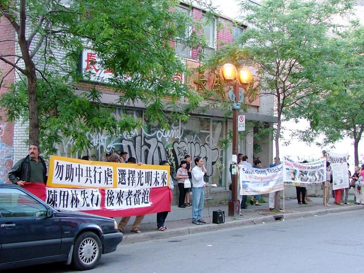 At 7pm on June 20, 2005, Chinese Ambassador Lu Shumin in Canada visited Montreal, and the Chinese community held a banquet for him at Hongbaoshi Restaurant. Falun Gong practitioners went to appeal, strongly protesting the Chinese Communist Party (CCP) murder of Falun Gong practitioner Gao Rongrong, demanding an immediate end to the persecution of Falun Gong and punishment for the murderers.