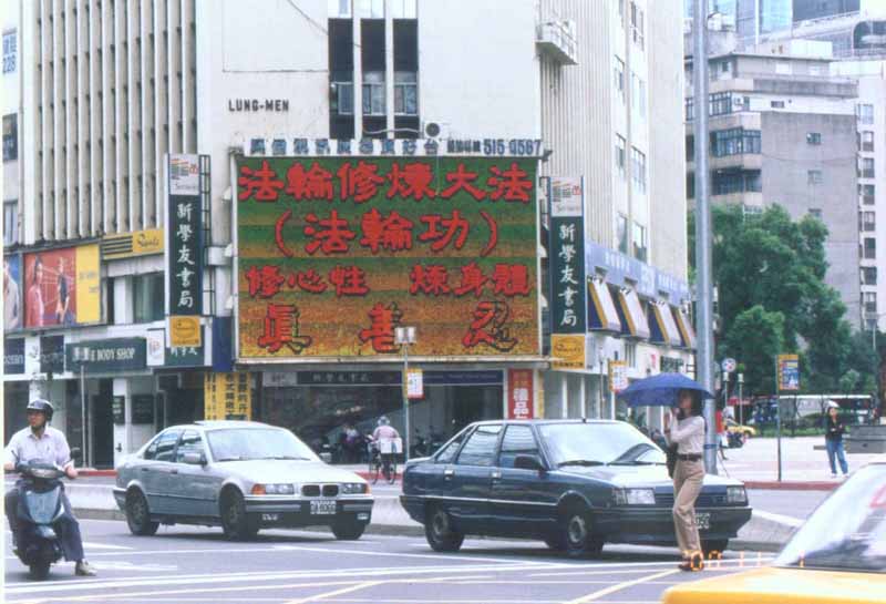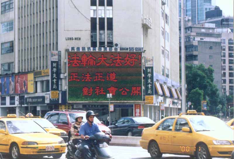 The Dinghao business district is the most populated area on the east side of Taipei. A practitioner rented the outdoor video screen in the district for the next two months.