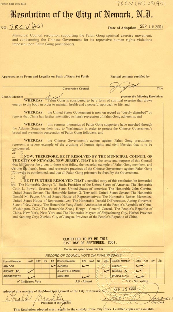 Resolution Supporting Falun Gong , Newark, New Jersey