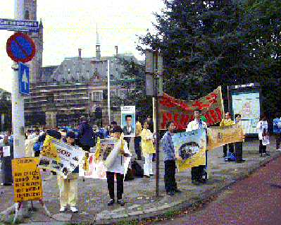 In front of the Royal Peace Palace in The Hague, about 100 Falun Gong-practitioners assembled to give a peaceful demonstration against the human rights violations against Falun Gong practitioners in China. Special attention was given to the case of Zhao Ming. An Irish student who was arrested during his holidays in his homeland China, simply for practicing Falun Gong. He endured inhuman torture and is still detained.