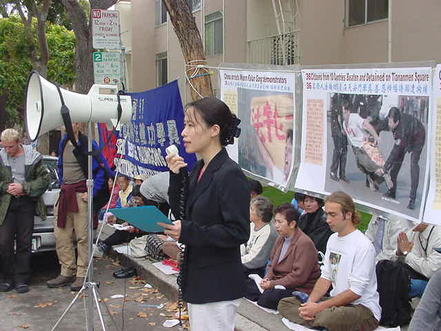 Around 120 Falun Gong practitioners from the San Francisco Bay Area gathered in front of the Chinese Consulate at 1:00 p.m. on November 20, 2001 to protest the Jiang Zemin regime's arresting of Western practitioners. They sent forth righteous thoughts and read a declaration of the arrested Western practitioners in both Chinese and English. They requested the immediate release and safe return of the practitioners. Among the arrested Western practitioners, at least two were from California.