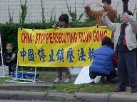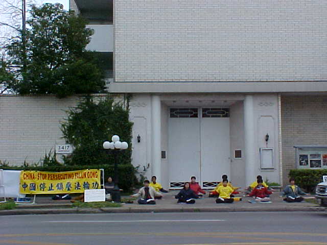 At 2:30pm on February 11, Houston Falun Gong practitioners held a news conference in front of the Chinese consulate to clarify the truth of the self-immolation incident. They hung up many banners written in Chinese and English, reding "Falun Dafa---Truthfulness, Benevolence, and Forbearance", "China: Stop Persecuting Falun Gong", and "We urgently request a thorough investigation into the truth about the Tiananmen Square self-immolation incident". Practitioners also carried all kind of pictures. Houston TV channels 26 and 39 and the Houston Chronicle were among the conference's attendants. They took down the words on the banners and then interviewed some practitioners. Practitioners gave the reporters materials that clarify the truth of the self-immolation incident. Practitioners also answered their questions. Dozens of practitioners demonstrated the five sets of excises for them, and also stressed that practitioners should always conduct themselves according to the principles of Truthfulness, Benevolence, and Forbearance and we are against any form of killing. During the entire news conference, practitioners were in a peaceful and tranquil energy field.