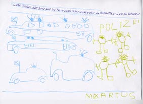 He went with his mother and brother to Geneva to appeal to China to stop the persecution of Falun Gong. He could not understand the behavior of the Chinese police. After he practiced on the muddy ground of Place Des Nations Park, he drew a picture and asked his mother to write on it the words: "Respectable policemen, please stop arresting and suppressing Falun Gong practitioners." He hoped that the picture would be handed over to policemen in Mainland China.