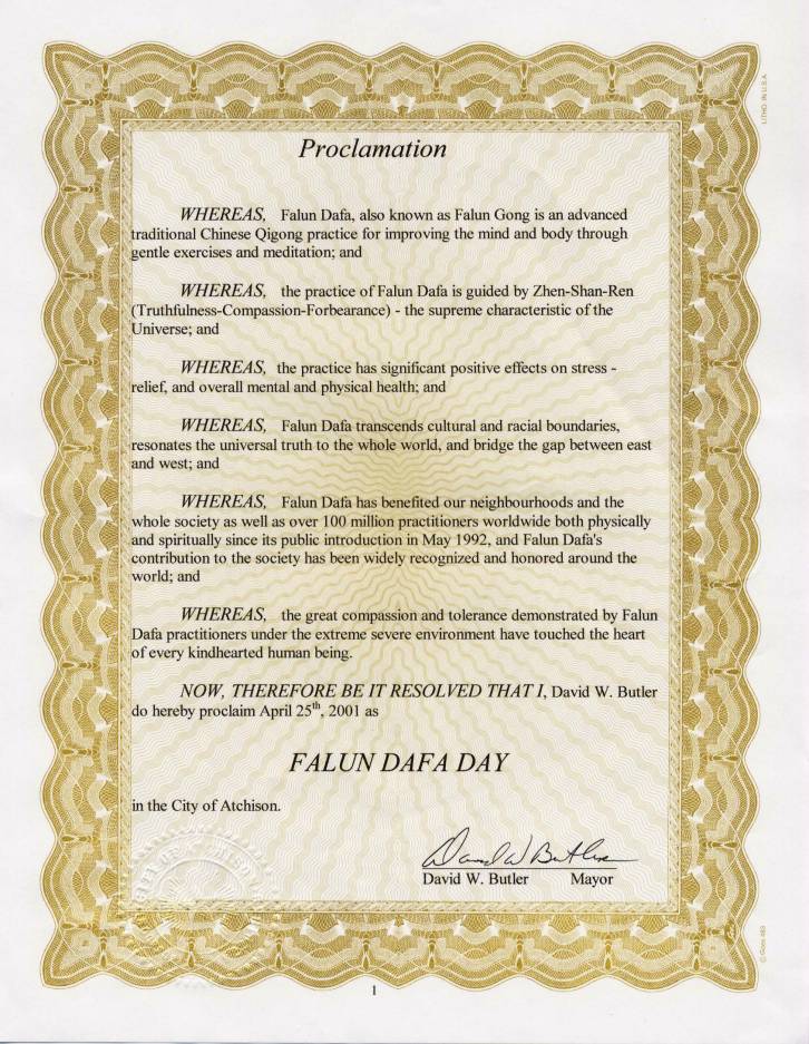 “Proclamation of Falun Dafa Week, City of Saskatoon, Saskatchewan, Canada [04/23/01-04/29/01] ”