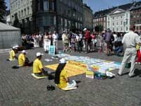 Along with all the righteous people in the world, practitioners worldwide participated in this event. On the morning of June 26, more than 20 practitioners from Denmark, Sweden, and the US came to the new square in downtown Copenhagen. We showed the pictures of practitioners being persecuted in China and the banner of "Zhan-Shan-Ren." Some of us were doing the exercises and some were distributing flyers. Many people stopped to looked at the photo exhibition and read the truth-clarifying literature.