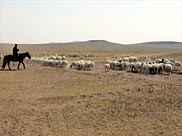 | Sheep and goats, watched over by a herder on horseback, search for grass on almost barren ground near Bayindeligar in central Inner Mongolia. | Outside her house near Bayindeligar, Jibutsima, 78, told how the grass had disappeared and asked, ''Can it be that nature is changing?'' |