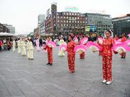 When practitioners reached the intersections of the pedestrian pathways, they halted and made a stationary posture. Then they danced towards the city hall plaza -- the central spot of the Asian Cultural Festival. There were only a few Chinese performers on the high stage in the plaza. It seemed that this was the interval between performances. We walked and danced around the plaza, using our serene and peaceful demeanor to display the truth about Dafa to the precious Chinese people.