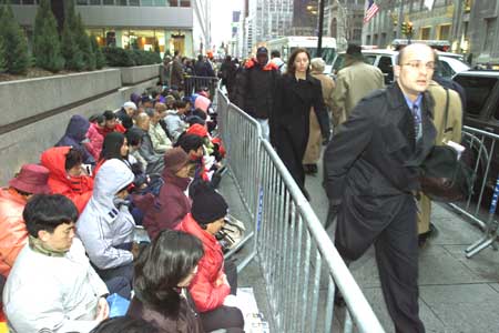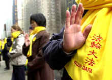 2002-2-2-nyc01.jpg (25784 bytes)Pedestrians pass a group of Falun Gong practitioners who staged meditation exercises on Park Avenue across the street from the Waldorf-Astoria Hotel in New York on Thursday.