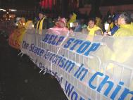 During the exercise demonstration, the practitioners standing beside the street held banners or distributed truth-clarifying literature. Kind-hearted people experienced the power of righteous thoughts at the peaceful and serene scene and voiced their approval. After the September 11th terrorist attack, the police strengthened precautions for all large scale activities and were very alert for the World Economic Forum. However, the Falun Gong practitioners' Hongfa and truth-clarifying activities are different. The peaceful activity created a safe atmosphere. The number of practitioners demonstrating the exercises increased from one hundred to over three hundred, so the police graciously expanded the demonstration area several times and offered another place in the neighboring block in the afternoon.