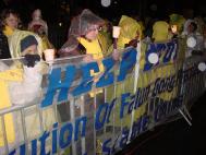In was cold and rainy in New York today, but the inclement weather did not stop the practitioners from clarifying the truth. At 8:00 a.m., Falun Gong practitioners gathered in front of the Waldorf Hotel, the forum location. New York police designated a place on sidewalk for the practitioners. At 9:00 a.m., the practitioners sent forth righteous thoughts together to eliminate all evils damaging Dafa. The exercise demonstration then began along with the exercise music. For this activity, Falun Gong practitioners wore the golden scarves designed and made by Taiwanese Dafa practitioners, which kept the cold away. The scene of golden color also displayed Dafa's peace and dignity.