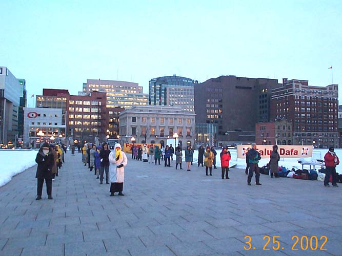 (Clearwisdom.net) Recently, Jiang's Political Gang escalated its persecution against Falun Gong practitioners. According to information from China, since the broadcast of the Falun Gong video revealing the truth on March 5 in Changchun, Jilin Province, the conservative estimate is that over 5,000 practitioners from the area have been rounded up and practitioners are being tortured to death almost on a daily basis. Dafa practitioners from Changchun City are in a very dangerous situation. In order to stop Jiang's atrocity and call for Canadian people from all social circles to help end the national terrorism in China, on March 25, over 70 practitioners from Ottawa and Montreal of Canada went to Parliament Hill and held a two-day appeal and mourning activity.