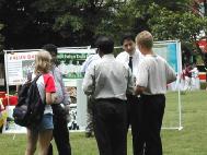 (Clearwisdom.net) On May 13, the day marking World Falun Dafa Day, the 10th anniversary of our great benevolent Teacher teaching the Fa and over 60 Atlanta practitioners held an entirely new type of celebration activities. Decorated with colorful balloons and flower wreaths, the characters of "Truthfulness, Compassion, Tolerance" and "Falun Dafa" were very eye-catching. Dressed in their holiday best, practitioners sang and danced to show the wonderfulness and sacredness of Dafa. They used large display boards to show people the history of Falun Dafa over the past ten years.