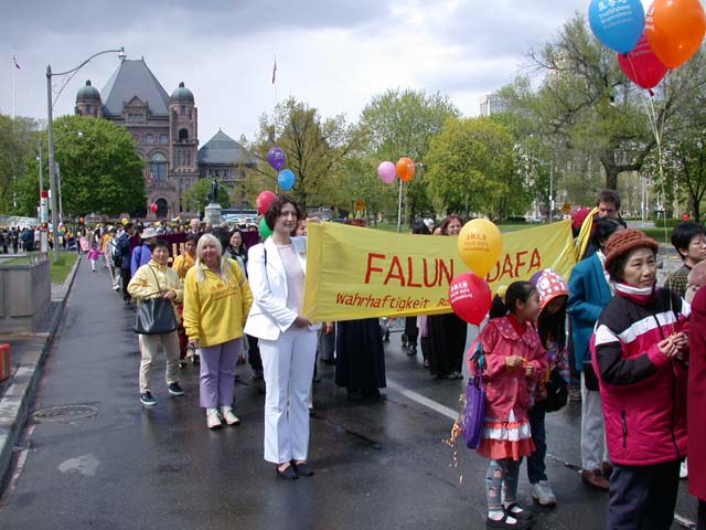 On the afternoon of May 19, at 2:00 p.m., nearly 1500 Falun Dafa practitioners from 15 countries held a grand celebration parade. The parade group passed through College Street in University of Toronto and extended to the main avenue of Chinatown. The long parade procession and Dafa practitioners' peaceful and compassionate smiles brought upon the city a happy, cheerful festival atmosphere.