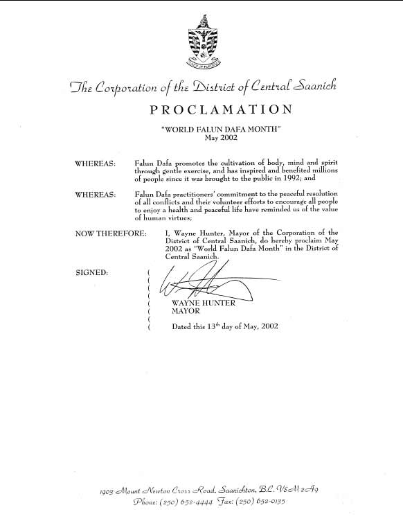 Proclamation of Falun Dafa Month, the District of Central Saanich, British Columnbia, Canada [May 13, 2002]