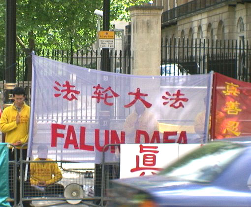 delegation's route, UK practitioners demonstrated the Falun Gong exercises and peacefully appealed