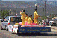 Practitioners from around Colorado participated in such a parade. Their specially decorated float stood out well in the parade. Practitioners wearing yellow practice suits demonstrated Falun Dafa exercises on the float while others distributed flyers among the spectators. A lady did heshi in appreciation while accepting Dafa information. Some people followed to get a flyer. The day after the parade, people started to inquire about where to attend the Falun Gong class. Rifle is a small town but so many people, like the people in many corners of the world, are yearning for Dafa.