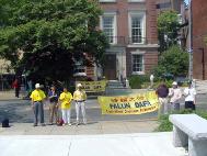 Around 11:30 a.m. August 5, practitioners from the Washington DC area came to Hong Kong Economic and Trade Office in Washington DC and unfurled three banners that said "End the Political Trial," "Falun Dafa," "SOS," as well as other banners. Three Falun Gong practitioners contacted the security guard and asked for a talk with the officials in the office. After several contacts through the security guard, the officials of the Hong Kong Economic and Trade Office refused the request to talk, using the excuses of "in meeting" and "have no time." The security guard told the practitioners that she knew that Falun Gong is peaceful. In the end, she agreed to deliver the practitioners' press statement and videotape showing that the Hong Kong policemen used violence to arrest the practitioners in front of China Liaison Office in Hong Kong. A Chinese media reporter witnessed the whole event.