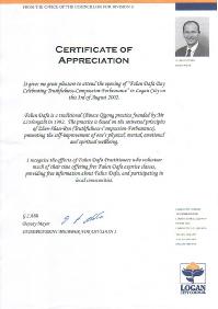 At 11:00 am, a short ceremony was held celebrating "Truthfulness--Compassion--Forbearance" in Logan City. The spokesperson for Queensland briefly explained to the people gathered there what Falun Dafa is, the history of Falun Dafa in Queensland and the many benefits people had experienced over the years practicing Falun Dafa. Two Proclamations and Certificates of Appreciation were also read out from the Deputy Mayor and one of the Councillors.
