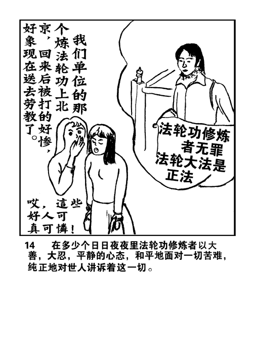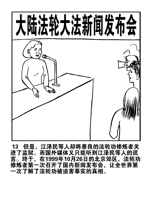 12. After July 20, 1999, many practitioner exercised their Constitutional right to appeal -- they went to Tiananmen Square, their local government agencies, etc, all just to let everyone know what the truth really was.Words in the cartoon: Falun Dafa is good.
