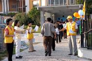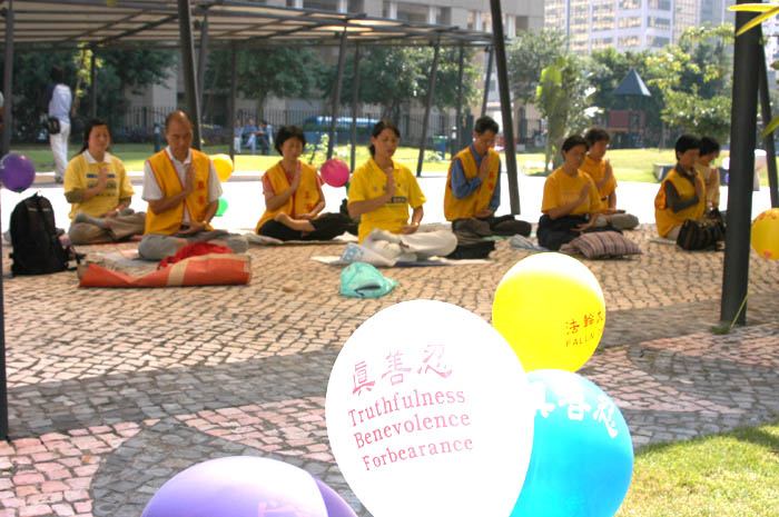 (Clearwisdom.net, October 20, 2003) On October 17, the chief member of Jiang regime, Zeng Qinghong, the Vice-President of China came to Macao to attend some subscription ceremony. Because of his coming, numerous policemen and plainclothes officers in Macao were dispatched to enforce martial law or to watch the suspected. Although the circumstances were difficult and full of pressure, Macao Falun Gong practitioners used their righteous thoughts and righteous actions to hold peaceful activities including studying the Fa, sending forth righteous thoughts and clarifying the facts to protest Jiang regime's bloody persecution of Falun Gong. From 10:30 a.m. to 11: 45 a.m., practitioners distributed truth-clarifying materials in front of the business-discussion hall and the Press Bureau. One after another, local residents and tourists accepted and read the materials. In a short while, 2,000 packets were distributed. From 1:20 p.m. to 2:20 p.m., practitioners gathered at the small park in front of the Chinese Liaison Office to study the Fa, practice the exercises and send forth righteous thoughts. Then they distributed flyers and explained the facts to tourists from Mainland China outside the Pujing Gambling House. The activities continued to 6:00 p.m. when practitioners joined the global synchronous sending forth righteous thoughts. They continued their routine Fa-study and sending forth righteous thoughts from 8:00 to 10:00 p.m.