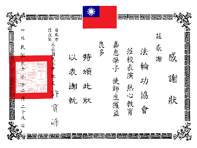 Recognition from Taipei City Yongchun National Elementary School on December 29, 2001