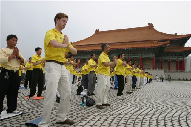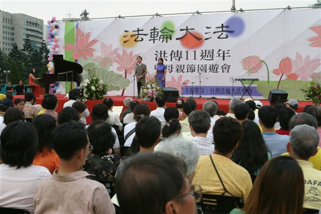 On May 11, 2003, Taiwan Dafa practitioners came to a fair at the Taipei Chungchen Memorial Hall Square. They promoted Falun Dafa and celebrated the 11th anniversary of Falun Dafa's Introduction by practicing the exercises, and holding a concert and picture exhibition. Recently, Taiwan was severely impacted by SARS and many large-scale events were cancelled. But people were very enthusiastic in this fair. Many people started to learn the exercises at the site. As for the fair itself, crowds filled the nearly hundred booths and all snacks, drinks, and other products quickly sold out. Truth-clarifying videos were played and behind the practitioner's booth was a Falun Dafa picture exhibition. Both had positive effects. The concert attracted many people too. The wonderful performances displayed the talents of Dafa practitioners.