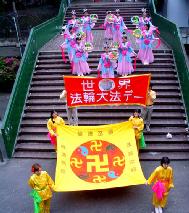The procession was long and vast. Ladies with classical dresses marched at the beginning and were followed by a float with fresh flowers. The words "Truthfulness, Compassion and Tolerance" in Chinese on the head of the float were very eye-catching. Practitioners in golden suits demonstrated Falun Gong exercises on the float. A banner reading "World Falun Dafa Day" followed four lady practitioners holding a Falun emblem. The Northeast China Folk Dance Team and practitioners with Tang dresses danced along the way, followed by practitioners with various banners.