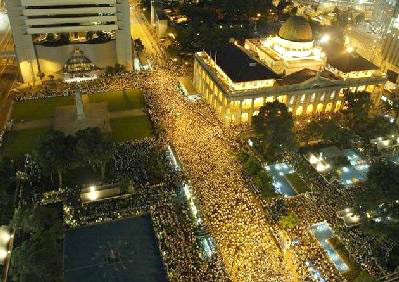 People constantly waved fluorescent glow sticks and sang the activity's theme song, "Heart to Heart", to express the Hong Kong people's wish: "Oppose Article 23, Return Power to the People."