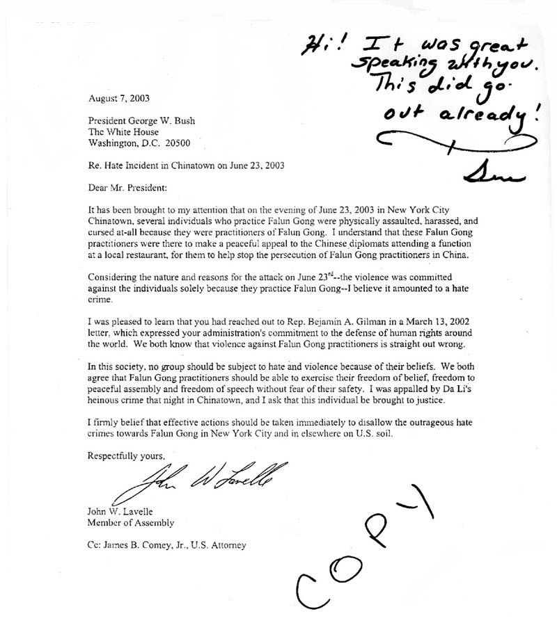It has been brought to my attention that on the evening of June 23, 2003 in New York City Chinatown, several individuals who practice Falun Gong were physically assaulted, harassed, and cursed at-all because they were practitioners of Falun Gong. I understand that these Falun Gong practitioners were there to make a peaceful appeal to the Chinese diplomats attending a function at a local restaurant, for them to stop the persecution of Falun Gong practitioners in China.