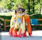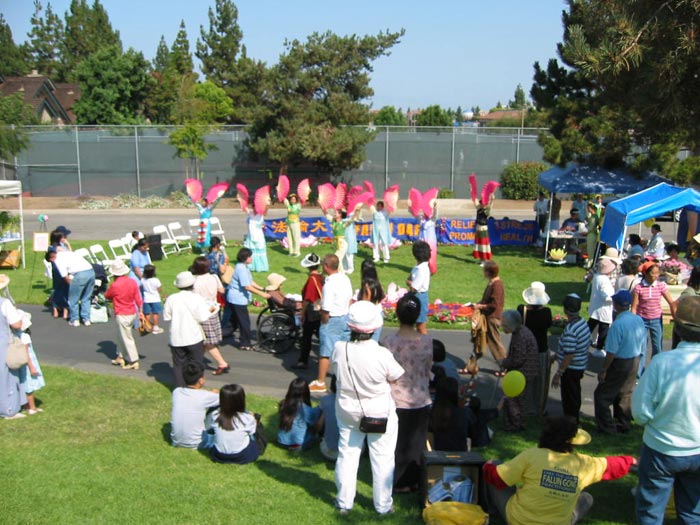 (Clearwisdom.net, September 2, 2003) On August 30 and 31, Chinese people residing in the San Francisco Bay Area held a two-day "Mid-Autumn Festival Garden Party" at Memorial Park in the City of Cupertino. On this long weekend, the sunshine was bright and moderate breezes blew gently. Nearly 100,000 bay area residents came to attend the garden party, making it a good opportunity to clarify the facts to the public. Falun Gong practitioners performed a set of Chinese folk dances including "colorful lamp dance," "lotus flower dance," "heavenly flying girl dance" and other folk dances. They also demonstrated Falun Gong exercises during the intervals between performances.