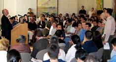 (Clearwisdom.net, September 22, 2003) On September 17, the U.S. Ambassador to China, Mr. Clark T. Randt Jr. made a speech at Yale entitled, "The U.S. --China Relationship and Development of Law." Afterwards, he spent more than an hour answering questions raised by students and scholars. He was asked several times about the persecution of Falun Gong in China, American citizen Charles Li who is currently illegally imprisoned in China, and the Judge's decision in the Chicago lawsuit against Jiang Zemin. Mr. Randt clearly answered the questions one by one. A Falun Gong practitioner asking questions.