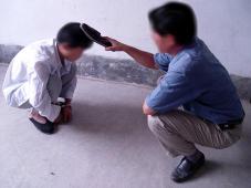 Practitioners are forced to squat with their hands cuffed. Their upper and lower legs are tied with towels, and theirs hands are tied around the ankles. This position does not look that bad, but it is very painful after a long period of time. Especially when being pressed down on by thugs, the part behind the knee is extremely painful. Sometimes practitioners were forced to remain in this position for more than 30 days, and they were not allowed to sleep This torture method made Mr. Zhan Haigang's face turn a purple, blackish color.