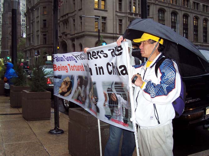 Practitioner Julia said, "Today, the wind is so fierce that many passers-by have their umbrellas turned inside-out." It was very chilly and many practitioners' clothes were soaked, but they still stayed there and persistently clarified the truth to people. The Jiang group's persecution of Falun Gong has lasted for more than five years. Although Jiang is no longer in power now, the evil is still putting up its last-ditch struggle. As long as the suppression goes on for even one more day, no matter how bad the weather is, we will continue exposing the malicious crimes.