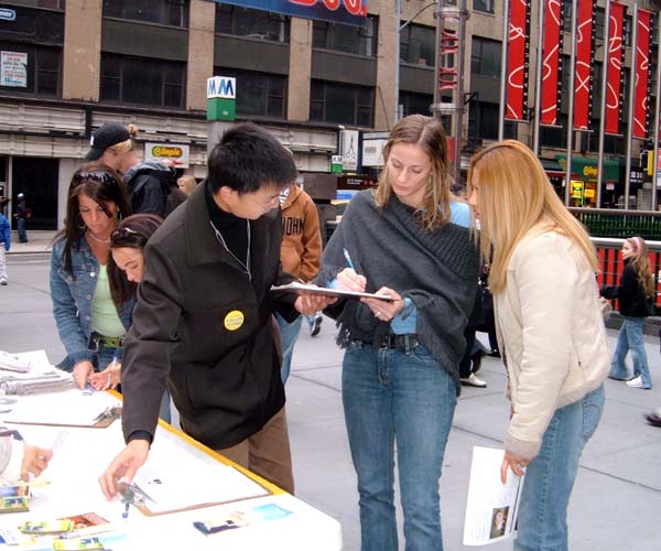 A young lady named Anna came across our anti-torture exhibition on Broadway and said excitedly, "I finally find a signature form to sign." While signing, she said to a practitioner, "Why don't you put signature forms at each intersection? I read your leaflet and newspaper a few weeks ago. I have thought about how to help you. But you don't want money. Someone told me to sign to support the appeal for an end of the persecution. Then I started to look for a signature form. Today I finally found it. I am so happy." Before leaving, she said, "I will contact you because I'd like to learn the exercises."