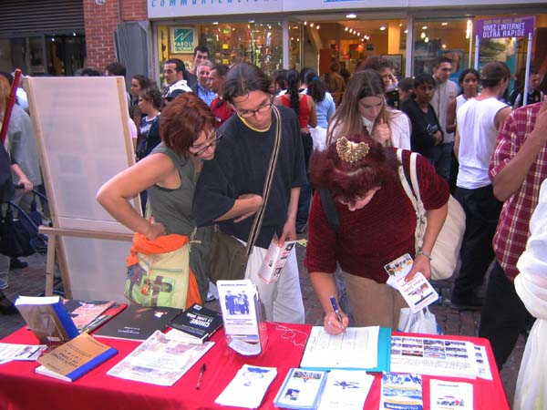 Many people wanted to find out more about Falun Gong. Even the practitioner who had played the role of a Chinese policeman in the anti-torture exhibition was surrounded by people eager to understand the facts of the persecution. People were enraged by such brutal violence and expressed their willingness to help. Some took lots of leaflets for their acquaintances. One college student took away a pile of leaflets. He said that he wanted to put them in the college classrooms for the teachers and students to read. Others decided to tell the facts of Falun Gong to those around them. Still others decided to write letters to the Chinese Government and the French Government, calling on people to stand up against the persecution of Chinese Falun Gong practitioners. People stood in line to sign the petition in their effort to bring the instigator of this persecution, former Chinese leader Jiang Zemin, to justice.