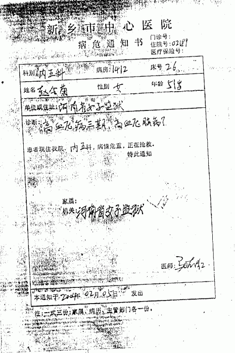 Due to the extremely brutal torture, Zhao Huiju's physical condition became very weak and she was twice rejected admission to the Xinxiang Jail. However, the judiciary department of the Lushan County refused to release her on medical bail or to allow her to serve the sentence outside of prison. On February 5, 2004, the Lushan court issued a document ordering the Xinxiang Jail to admit Zhaohui without regard to her poor her health condition. On the same day she was sent to the jail, she fell unconscious again. On February 8, her family members were informed that she was on the brink of death. When her daughter carried the two-month-old baby to visit her and saw her tortured beyond recognition, she burst into tears. Zhao's eighty-year-old mother was also crying sadly. Currently Zhao Huiju could die at anytime. We would like to ask the Xinxiang Jail to immediately release Zhao Huiju according to relevant rules and regulations. We also demand the police from the Lushan County who tortured Zhao be punished. We appeal to all the righteous people to condemn the torture of this good and kind person!