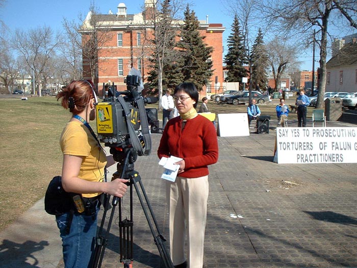 (Clearwisdom.net) On the morning of April 10, 2004 the air was filled with freshness and the sunshine was bright. After a long winter, spring had arrived in Edmonton. Beside the largest farmer market of the city, cars and trucks created a lot of traffic, but the pedestrians were attracted to a symbolic public trial of Jiang Zemin in the nearby park. Some people watched the trial, some asked for information, some read the display board carefully, and some signed their names on the petition postcards. This was the third time that Edmonton practitioners have held a symbolic trial of Jiang in the park.