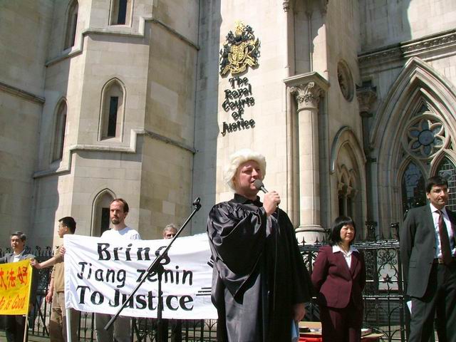 UK Falun Gong practitioners hold a symbolic trial of Jiang Zemin outside the Royal Court of Justice in London