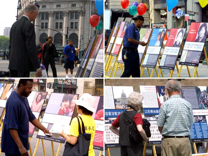 Today, on Forley Plaza, a symbolic trial of Jiang was held. Four witnesses used their actual experiences, and with conclusive proof they recounted the monstrous crimes committed by Jiang towards Falun Gong practitioners. They prosecuted Jiang for manipulating the state machinery and the state-controlled media to intimidate the entire nation into betraying their conscience and their sense of justice. Through this persecution, Jiang has completely distorted human nature.