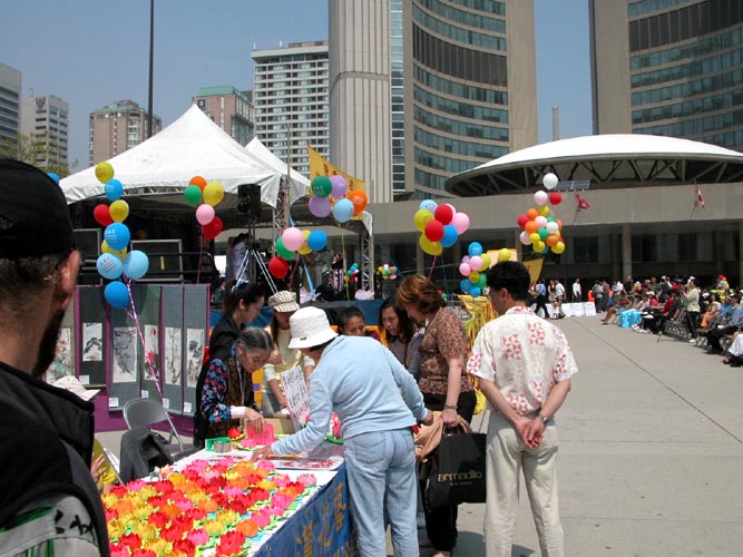 This is the sixth annual event held by Falun Gong practitioners on the City Hall Plaza since 1999 to celebrate the worldwide spread of Falun Dafa. On the morning of May 13, the weather was exceptionally good and there was no sign at all of the originally forecast thunderstorm. The plaza was bustling with lots of people coming and going. Many Chinese people also came after hearing of today's event. Some even drove 24 hours from Manitoba to attend the celebration. Numerous people requested for truth-clarifying materials. Several thousand English materials were distributed in a few hours. Many people asked where they could learn the exercises and where to buy Falun Gong books. Practitioners in charge of instructing the exercises were quite busy all the time. A constant stream of people came to learn the exercises.