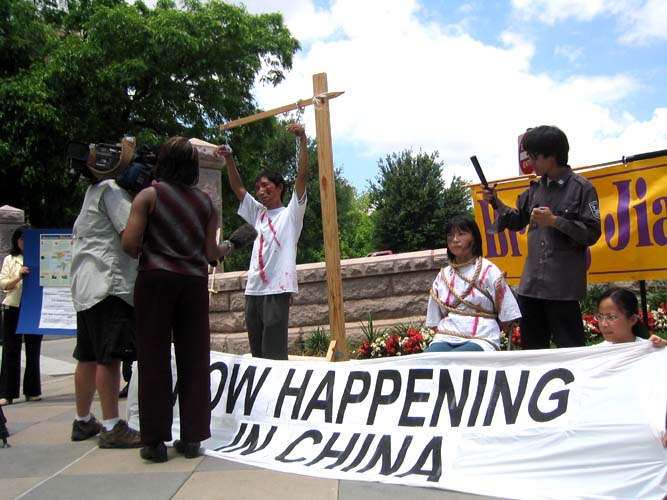 At noon, the van tour arrived at Austin, the capitol of Texas and held a press conference along with local practitioners to expose Jiang's inhumane persecution of Falun Gong practitioners. Right after, a symbolic trial of Jiang Zemin was held. Two practitioners demonstrated the torture methods frequently used by the authorities against Falun Gong practitioners in China.