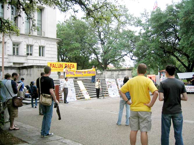 (Clearwisdom.net, May 5, 2004) With over 67,000 students, faculty, and staff members, the lunch-hour crowd on April 29, 2004 created quite a spectacle at the popular rally area at the University of Texas. At the top of a flight of stairs and overseeing the crowd below, Falun Gong practitioners unfurled two banners: one reading "Falun Dafa, Truthfulness-Compassion-Forbearance" and the other, "Bring Jiang to Justice."