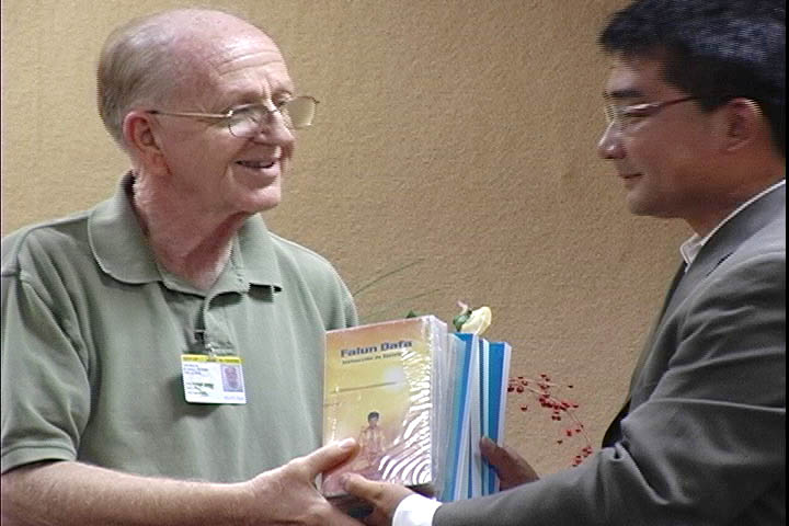 | ![]() Library director Receiving Falun Gong books and video tapes donated by practitioners to the library |