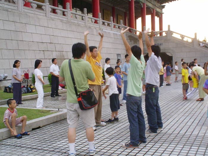 In the afternoon, some practitioners demonstrated the five-sets of Falun Dafa exercises, and some distributed flyers explaining the facts of the persecution. An elderly lady came over with her small granddaughter. The little girl asked her grandma, "What is this?" The grandma said, "Practice will not only improve one's health but also one's heart nature." Sunday evening is also the time for Minghui school students to practice the exercises outdoors. An adult said to his child, "One can freely practice the exercises in Taiwan. Let's go there!" Then he took his child to the young practitioners' site and learned the exercises there.