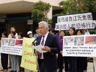 (Clearwisdom.net) After learning the news that Chinese Vice-president Zeng Qinghong was suspected of hiring gunmen to kill Australian Falun Gong practitioners traveling there to peacefully appeal to the persecution during his visit in South Africa on June 28, 2004, at noon on June 30, Falun Gong practitioners in Los Angeles gathered outside the Chinese Consulate to announce the details of the shooting incident, condemn Zeng Qinghong for employing hired assassins, and call upon governments of all countries, the media and people to join together to condemn Jiang Zemin's political group's act of terrorism and the persecution of Falun Gong, and to express that Falun Gong practitioners will not be frightened by such terrorism atrocities, and will definitely bring perpetrators and behind the scene instigators to justice.