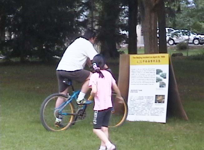 Dafa truth clarification photos and display boards were displayed along the alley of the park and attracted many people who were taking a walk. They stopped and attentively watched practitioners' orderly exercises. Some of them read carefully the truth clarification boards, and some had a conversation with the practitioners to learn about Falun Gong and the persecution in China.