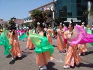 Falun Gong practitioners' procession, which included a banner team, dance team, waist drum troupe and float was one of the larger processions and was the only procession composed of Chinese people. The gracefully fairy dance performed by female practitioners dressed in colorful Tang Dynasty costumes, the waist drum troupe's bright yellow suits and their orderly movements, the huge lotus flower on the float as well as the large red banners with golden words, "Falun Dafa" and "Truthfulness-Compassion-Tolerance" in English and Chinese were extremely eye-catching under the bright blue sky and beautiful sunshine.