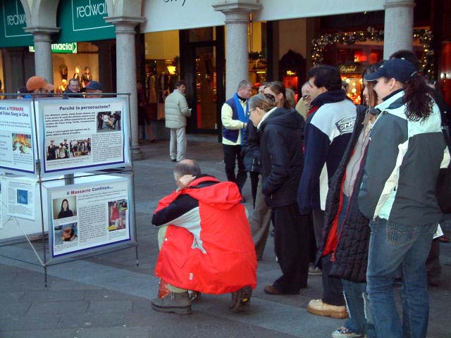 Lugarno is near Italy and people there speak Italian. Some Italian practitioners especially came to support us after they learned about the activity from the Internet. They brought display boards in Italian, which had a good effect in helping people find out more. Though Swiss practitioners had brought thousands of leaflets in Italian, they were soon all gone as almost every passerby took Falun Gong information.
