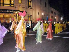 (Clearwisdom.net) Starting at 6:00 pm on November 25, 2005, nearly 100 organizations participated in the Ft. Worth Parade of Lights at Sundance Square in the downtown area. Tens of thousands of local residents came to watch the parade. This was the first time for Falun Gong practitioners in the Dallas area to take part in this parade. Their elegant procession drew the people's attention. Spectators could not help praising, "Beautiful! Very nice!"