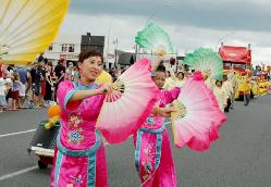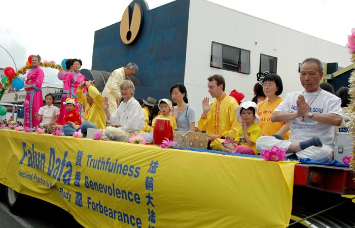 (Clearwisdom.net) Falun Gong practitioners in New Zealand were invited to participate in the annual Christmas Parade in Hamilton on December 11, 2005. The Falun Gong procession, composed of dance performances, exercise demonstrations, a float and a waist drum troupe, was the largest among all the participating groups. The practitioners' wonderful performance won waves of applause along the parade route. Parade spectators expressed their appreciation, calling out, "Gorgeous!" and, "Falun Dafa is good!"